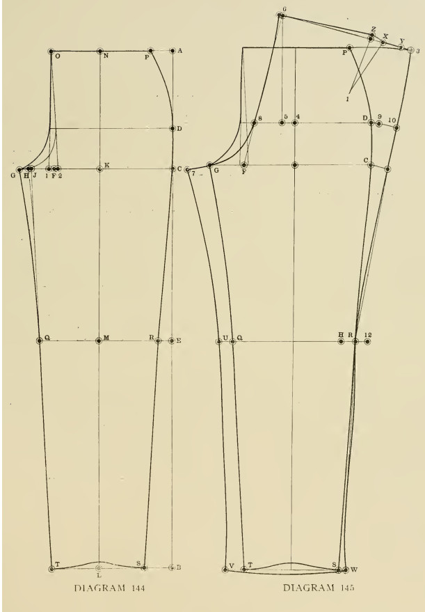 Obviously, most pants patterns tend to be divided into front/back pieces and not outside/inside pieces. That means adjusting the pattern front piece with an extra seam up the front and adding the necessary seam allowance. Which is where our old standby, The American Garment Cutter, shows up once more. Seriously. Men’s pants haven’t changed much since Mr. Regal’s day and it looks like they won’t change much by Captain Mercer’s, so why not? Plus, he’s already noted the centerline of the trouser front for us, saving just that little bit of work on our end.
